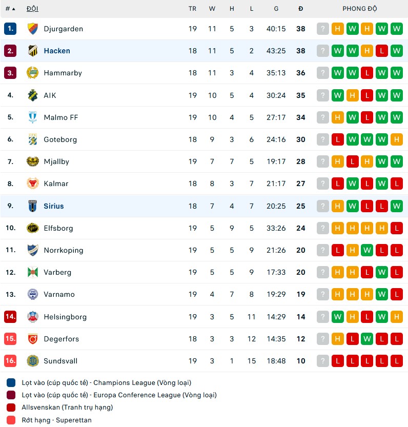 Bảng xếp hạng VĐQG Thụy Điển